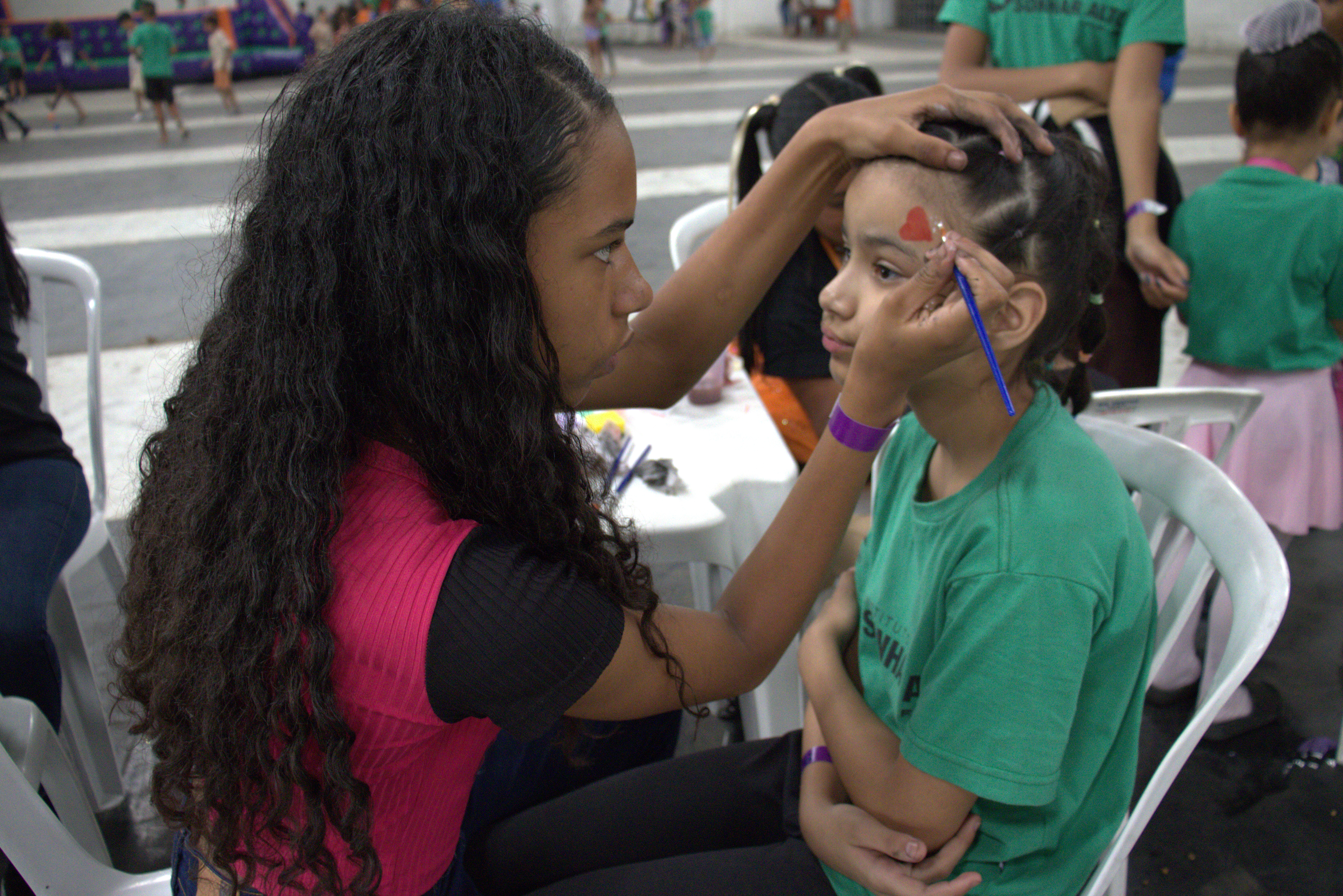 A programação foi organizada em equipes responsáveis pelas diferentes atividades: cozinha (preparo dos hambúrgueres), pintura facial, brincadeiras de rua, organização de filas e apoio às crianças menores, além da coordenação da entrada e saída dos participantes.